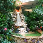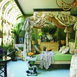 «Тропическая оранжерея» – это пальмы, лианы и бугенвиллеи. Обязательно журчание воды. Если зимний сад в коттедже – желательно бассейн. Разумеется, никаких канделябров, кронштейнов и витражей на стеклах. Все должно подчёркивать пышность растительности. Мебель – плетеная, освещение – естественное. Если искусственное, то мощными лампами дневного света… Клетки с экзотическими птицами; скрещенные малайские кинжалы на стене или африканские маски…