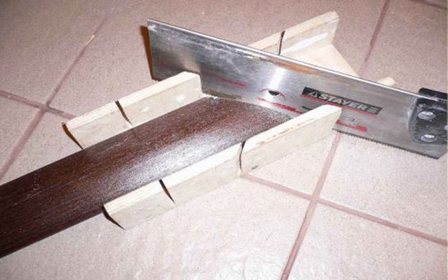 - Когда рассчитаны размеры деталей, приступают к нарезке. Наиболее распространенный способ порезки – под угол 45°. Подогнанный таким образом наличник можно стыковать по всему периметру блока. Для удобства используют специально приспособление (стусло), если его нет, разметку выполняют угольником.